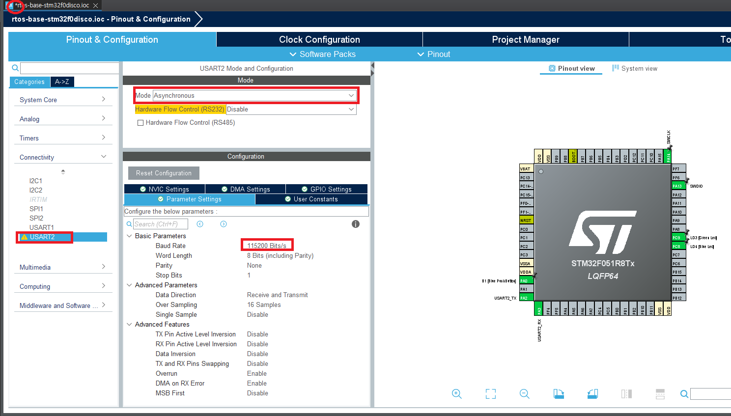 UART를 사용하기위해서는 USART2를 클릭하고 Mode 탭에서 Disable을 Asynchronous로 바꿔주는 설정을 해줘야 한다.