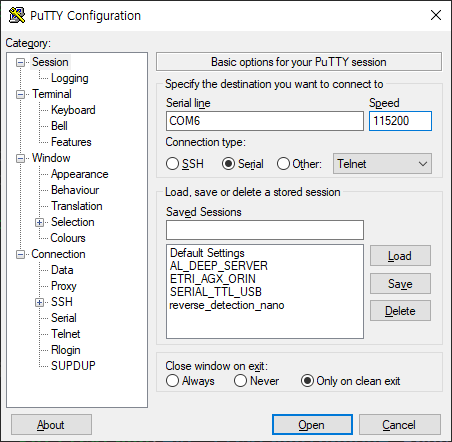 Putty에 접속하여 다음과 같이 설정 후 연결을 해본다.