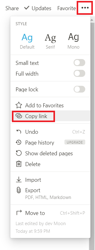 노션 페이지에 점 3개 아이콘과 Copy Link를 눌러서 페이지 링크를 복사할 수 있습니다.